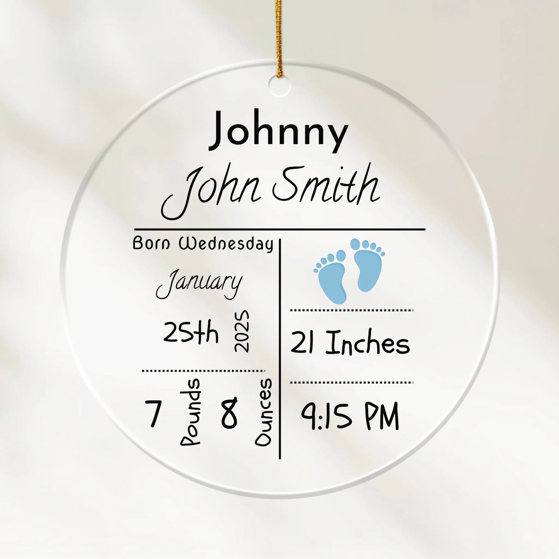 Capture all the precious details of your newborn's arrival with this comprehensive ornament. Personalize with their nickname, full name, birth details, height, weight, and choose pink or blue feet to signify gender. A detailed keepsake for an incredibly special moment.
